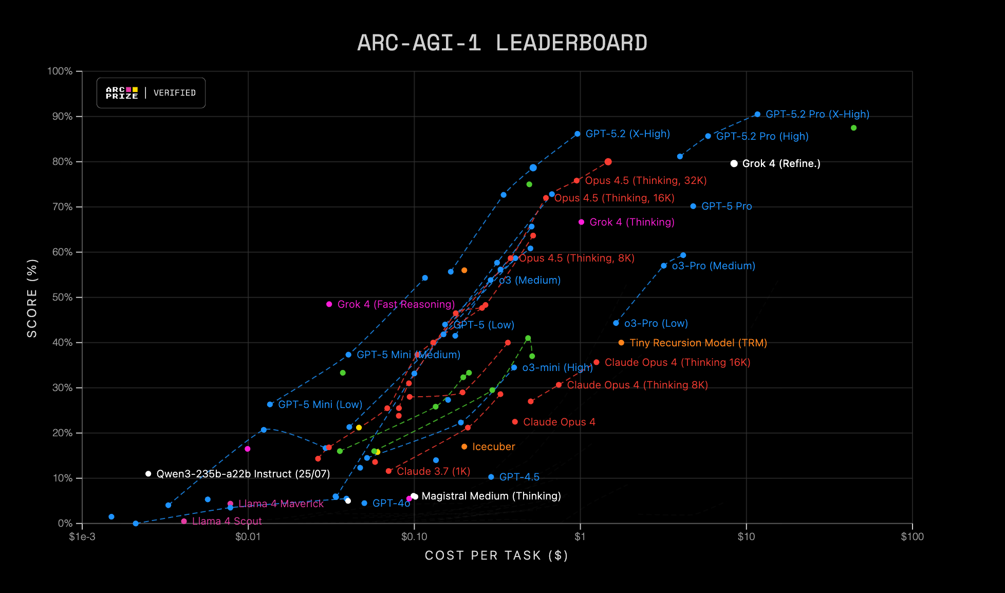 Open the ARC Prize leaderboard and you'll see scores climbing up and to the right. That looks like progress! But then you notice the x-axis isn't time—it's cost. Higher scores cost more per task.