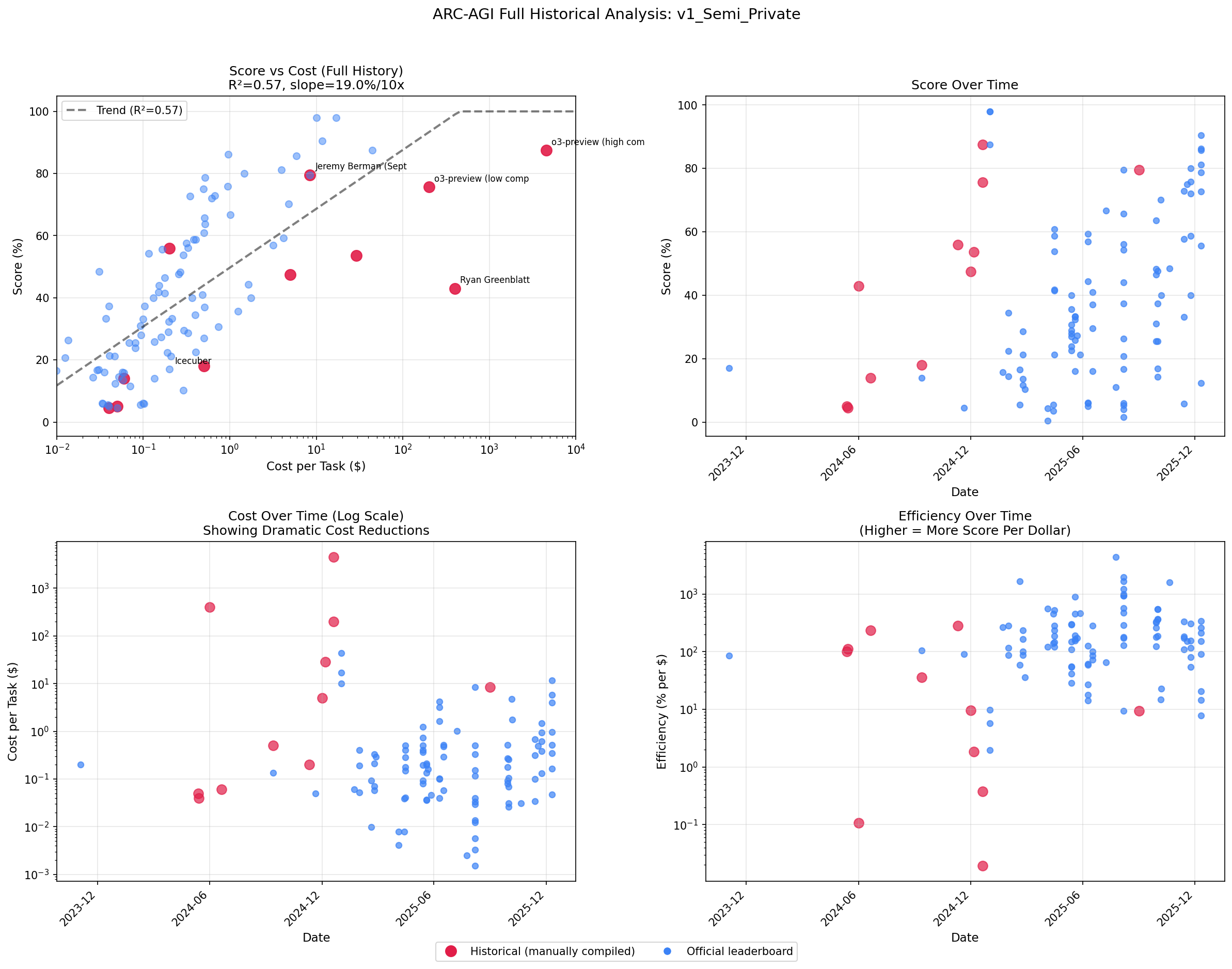 The leaderboard is a snapshot in time. Each dot shows the price and setup from when the result was achieved, but not what that same method might cost today. Models get cheaper, and even older models can improve with better techniques and scaffolding.