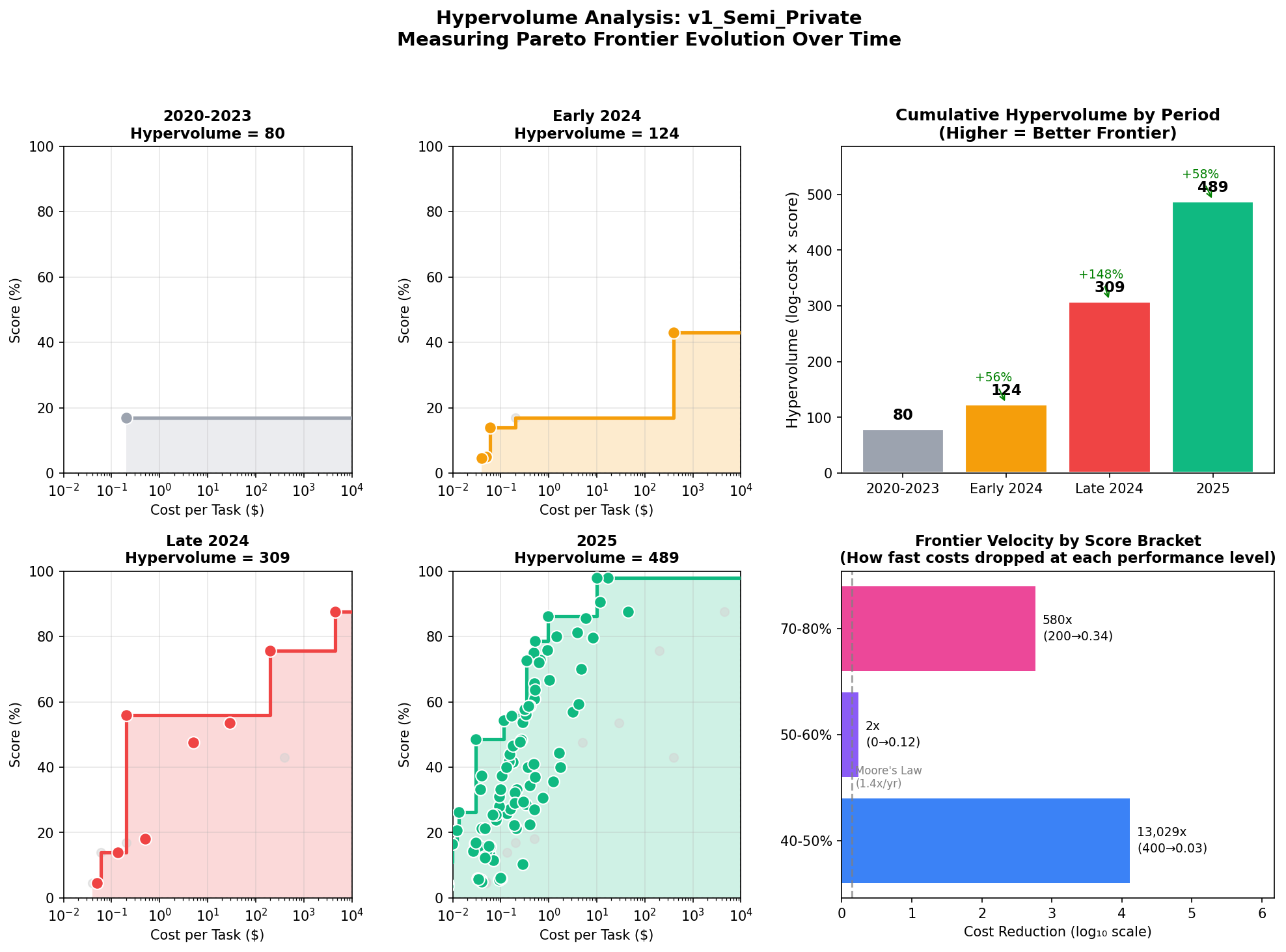 The hypervolume grew ~6x from 2020-2023 to 2025. That's not "a few points got better." That's the entire feasible cost-performance menu expanding.