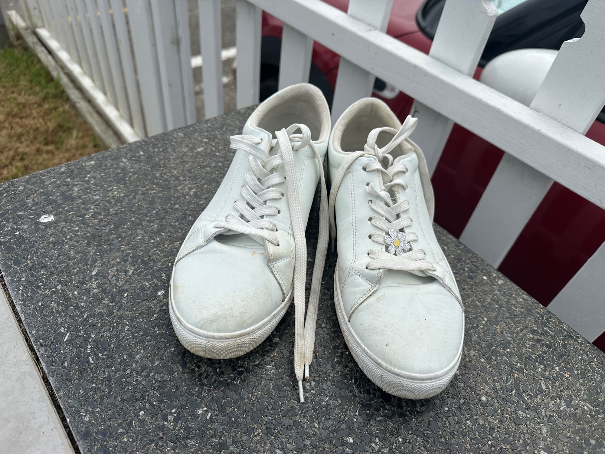 A little while after I got out of Tūmanako, another pair of white shoes appeared on a game table in the middle of our town. They had a single daisy sticker attached to the left laces.