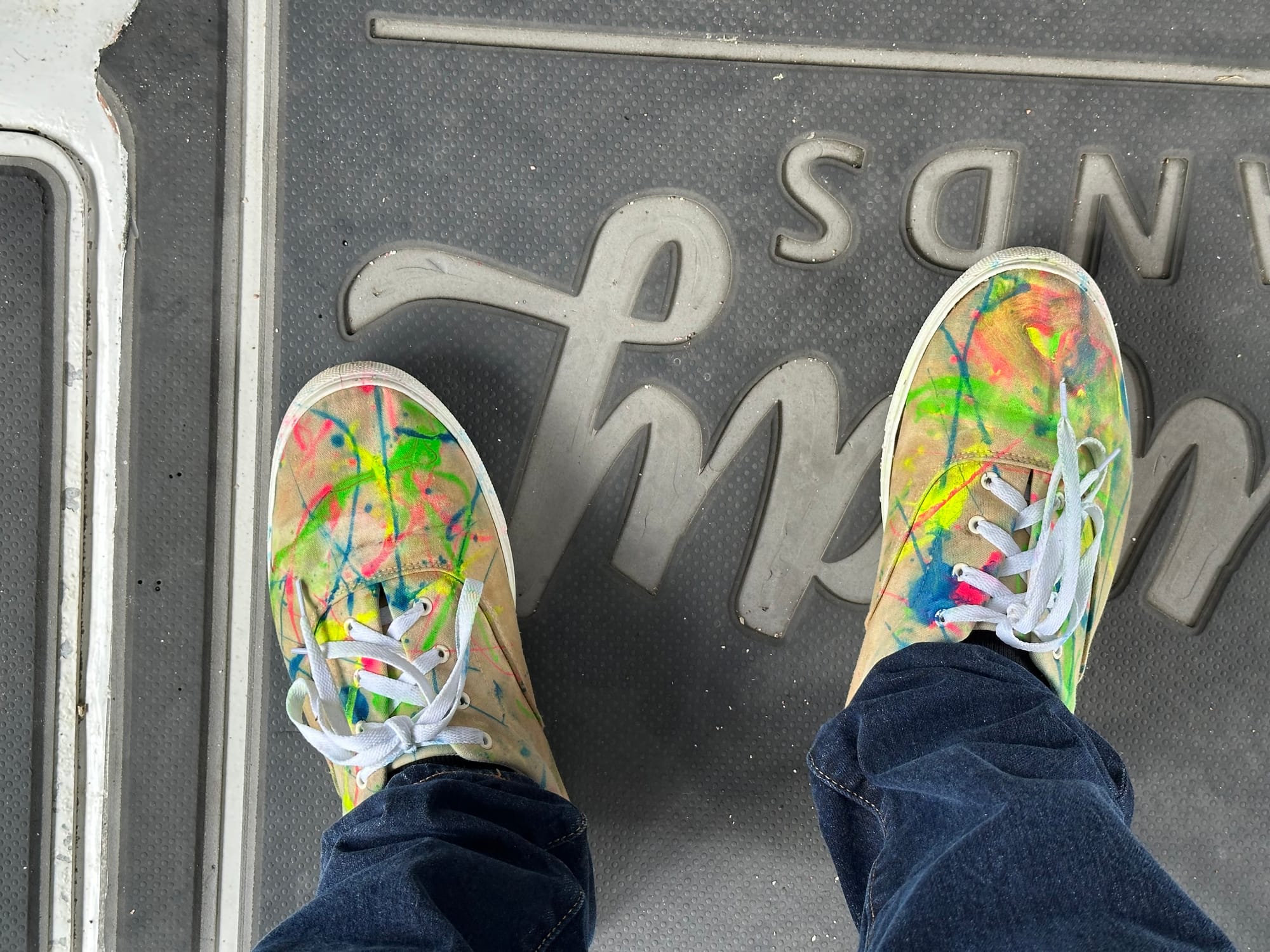 One of my friends at Tūmanako was a guy called Alex. He really reminded me of a guy I went to a performing arts college with. He gave me a pair of white shoes to wear. I got them dirty while performing some kind of ritual, so we tanned them using teabags to make them beige. Him and Jineka performed a karakia (a Maori blessing) over the shoes. We then splatter painted them with bright colors to make them unique. Alex then told me to write the words “spirit” and “aroha” (Maori for “love”) on the shoes, plus a ”celtic number”.